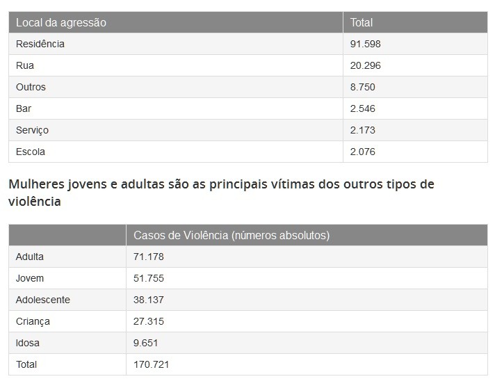 Segundo dados da primeira edição do levantamento, no caso das mulheres adultas, os maridos lideram a lista dos principais agressores. Já quando se coloca em perspectiva o tipo de agressor das adolescentes de 12 a 17 anos de idade, o peso se divide entre os pais, com 26,5% dos casos, e os parceiros ou ex-parceiros, com 23,2%.