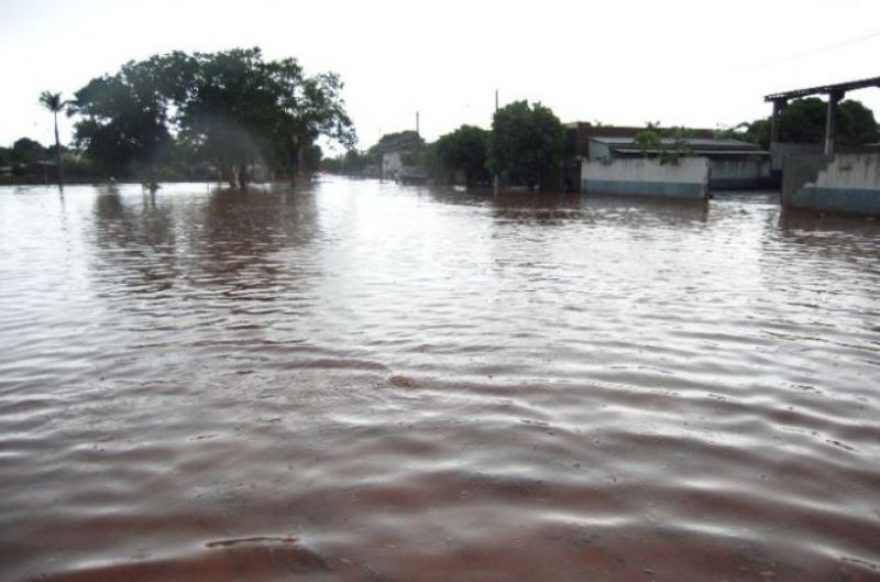 Forte chuva alaga ruas e lagoa transborda em Batayporã