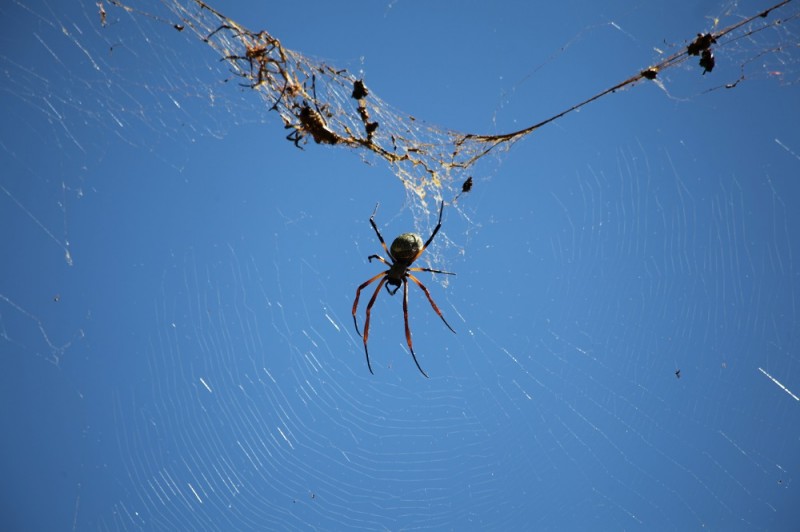 Aparentemente trata-se da aranha de teia dourado (Nephila Clavipes). Ela recebe este nome devido à coloração amarelada de sua extremamente elaborada e simétrica teia. Como seu veneno é muito fraco, depende dos fios pegajosos para manter seu alimento preso.