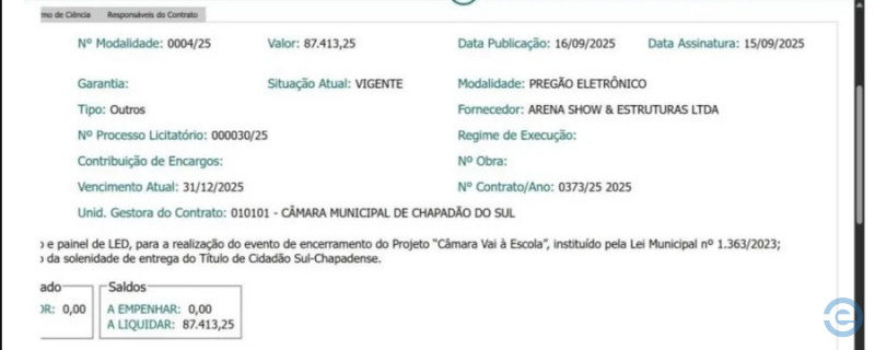 A Arena Show e Estruturas Ltda., empresa de Aquidauana-MS, foi contratada por licitação para entregar uma produção comparável a baile de debutante: Prestação de Serviços de Buffet com Decoração, Sonorização e Painel de LED, com profissionais qualificados, fornecimento de equipamentos de som e todo o aparato de buffet (mesas, toalhas, copos, taças, jarras de vidro, pratos, talheres, guardanapos, gelo e garçons), além de outros itens necessários.