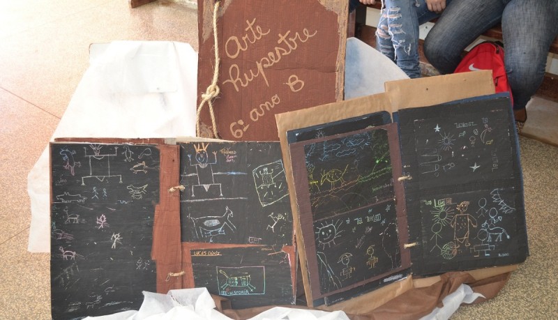 Uma turminha se encarregou de reproduzir a arte rupestre, lembrando das representações artísticas pré-históricas realizadas em paredes, tetos e outras superfícies de cavernas e abrigos em geral.