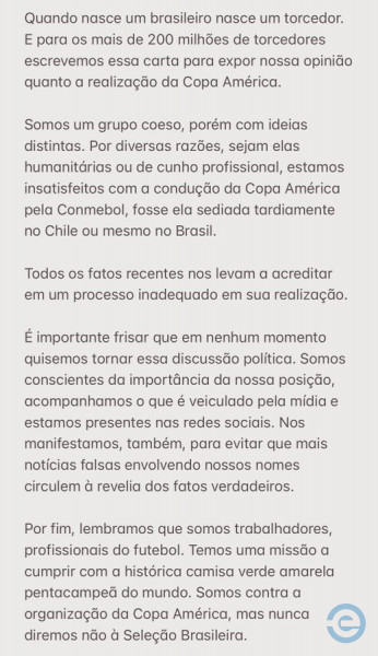 Em nota, jogadores da seleção criticam Copa América, mas negam boicote
