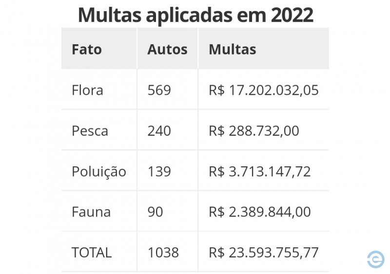O valor das multas aplicadas em 2022 foi inferior ao aplicado em 2021 (R$ 53,2 milhões). A PMA ressalta que o valor da multa depende do tipo de infração. “Por exemplo, no caso de poluição, as multas aplicadas podem ser de R$ 5 mil e chegar a R$ 50 milhões, dependendo do grau de danos causados e avaliados pelos policiais no momento da autuação”.