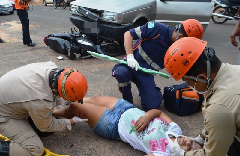 Mulher fica ferida em colisão entre carro e moto em avenida de Coxim
