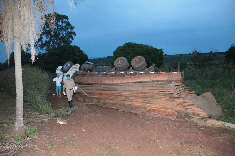 Motorista cochila ao volante e tomba caminhão na BR-163, em Rio Verde