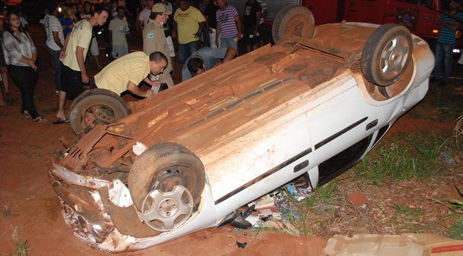 Para evitar colisão, condutor joga carro pra fora da pista e capota