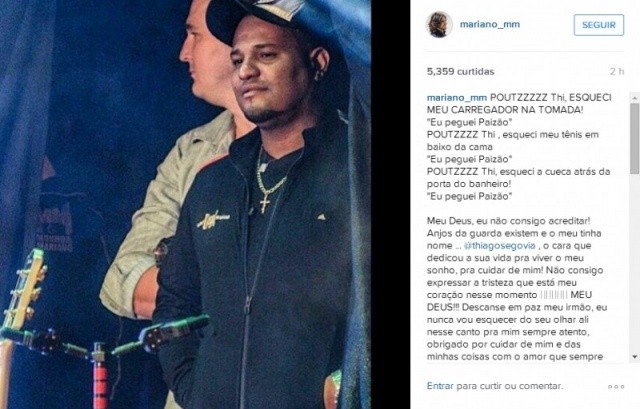 Em sua postagem, Mariano lembrou de momentos em que Thiago o ajudava e sobre a tristeza em perder um amigo. "Não consigo expressar a tristeza que está meu coração nesse momento. MEU DEUS!!! Descanse em paz meu irmão, eu nunca vou esquecer do seu olhar ali nesse canto pra mim sempre atento, obrigado por cuidar de mim e das minhas coisas com o amor que sempre fez, obrigado por ser esse amigo tão dedicado que sempre foi comigo! Descanse em paz meu anjo!", escreveu o cantor.