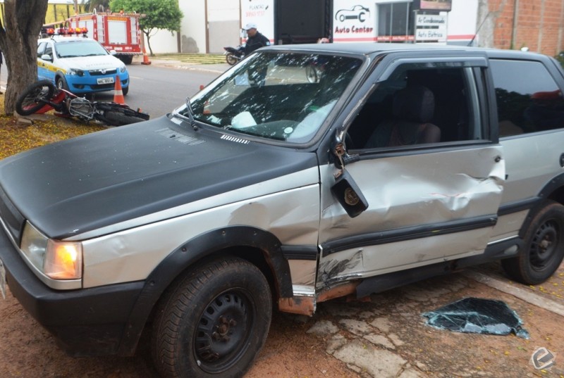 O cabo G.T. de 25 anos, ficou ferido numa colisão entre carro e moto ocorrida na manhã desta segunda-feira (5), na avenida Gaspar Ries Coelho, no bairro Morada Altos do São Pedro em Coxim.