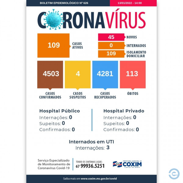 Coxim tem 109 casos ativos de Coronavírus, mas, nenhum internado