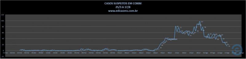 Coxim está descendo nas curvas de casos suspeitos, assim como de infectados por dia, depois de ter atingido, provavelmente, o pico do Coronavírus entre 21 e 28 de julho. O boletim epidemiológico mostra que nas últimas 24 horas não foram registrados novos casos. É a sexta vez que isso acontece em agosto.