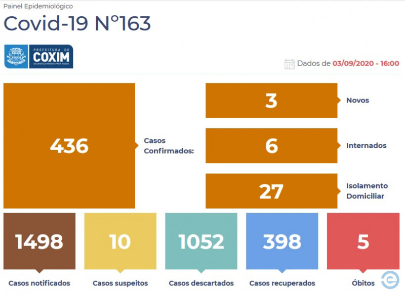 ImprimirDos 436 casos confirmados de Coronavírus (Covid-19) em Coxim, 398 já estão recuperados, conforme o boletim epidemiológico de número 163, divulgado na tarde desta quinta-feira (3), pela Prefeitura.