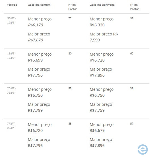 A maior variação registrada pela ANP entre 6 de março e 2 de abril foi na gasolina comum, acréscimo de 20,77%. No período, o menor preço registrado foi de R$6,179 enquanto o maior foi R$ 7,799. No combustível aditivado, o menor preço foi de R$6,320, o maior R$7,896, aumento de 19,95 %.