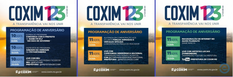 ImprimirNo próximo domingo, 11 de abril, Coxim completa 123 anos de emancipação político-administrativa e para comemorar o prefeito Edilson Magro (DEM) vai conceder entrevistas, participar de lives e inaugurar internet.