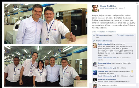 Em clima de campanha, Nelsinho posa ao lado de falso sósia no comércio para postar no Facebook
