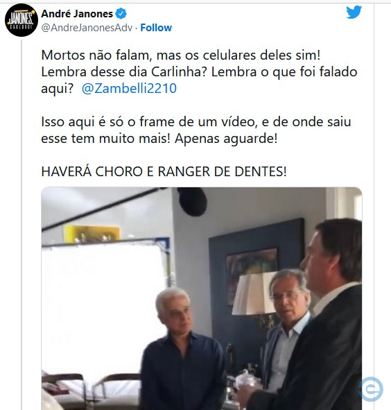 "Mortos não falam, mas os celulares deles sim! Lembra desse dia, Carlinha? Lembra o que foi falado aqui? Isso aqui é só o frame de um vídeo, e de onde saiu esse tem muito mais! Apenas aguarde! HAVERÁ CHORO E RANGER DE DENTES!", escreveu Janones, se dirigindo à deputada bolsonarista Carla Zambelli (PL-SP), ao divulgar uma das imagens que seriam de vídeos no celular de Bebianno.
