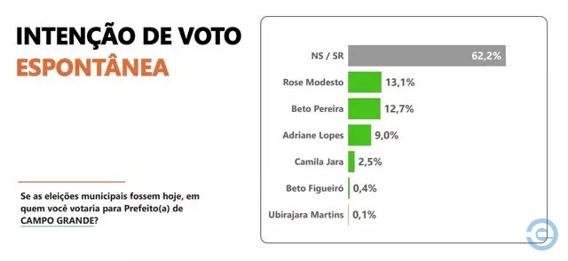Chama a atenção a quantidade de eleitores ainda indecisos, apesar da queda de 7,1%. Eram 69,3% na pesquisa espontânea divulgada pelo Campo Grande News no dia 22 de agosto e agora são 62,2%.