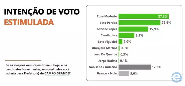 Beto Pereira (PSDB), Adriane Lopes (PP) e Camila Jara (PT) cresceram. O tucano ganhou dois pontos percentuais em relação à anterior, mantendo-se no segundo lugar com a preferência de 22,6% da amostragem.